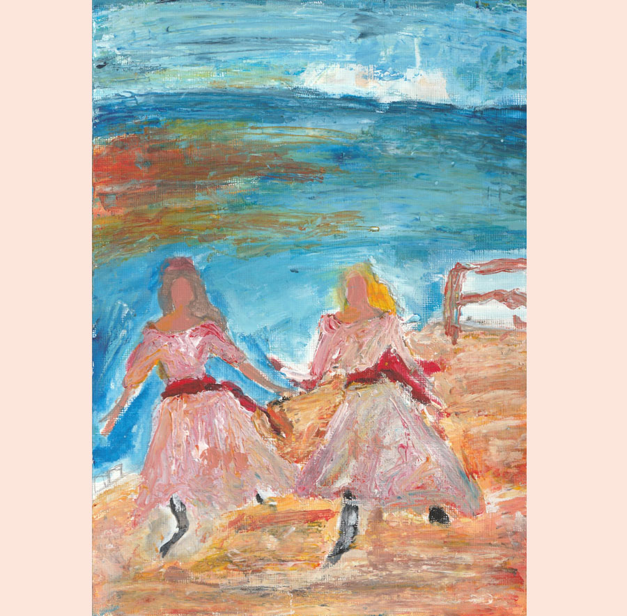 The escaping girls running on the pier. Cromer pier, Norfolk in the summer. Impressions, sun, and water.